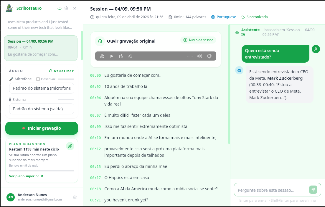 Clique em gravar antes da reunião começar. O Scribossauro captura o áudio do microfone e do sistema ao mesmo tempo.